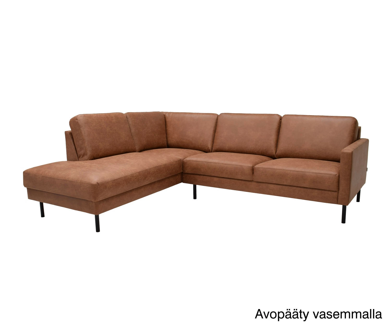 Puhdaslinjainen sohva tarjoaa trendikkään ulkonäön lisäksi hyvän istuttavuuden laadukkaiden ehmusteiden ansiosta ja sohvan korkea musta metallijalka antaa avokulmasohvan ulkonäköön sopivasti ilmavuutta helpottaen samalla sohvan alustan siivoamista.