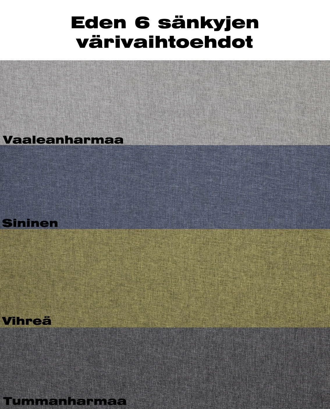 Eden sänkyihin voit myös valita verhoiluvärin viidestä eri vaihtoehdosta: harmaa, tummanharmaa, beige, sininen tai vihreä ja jalat useasta eri vaihtoehdosta