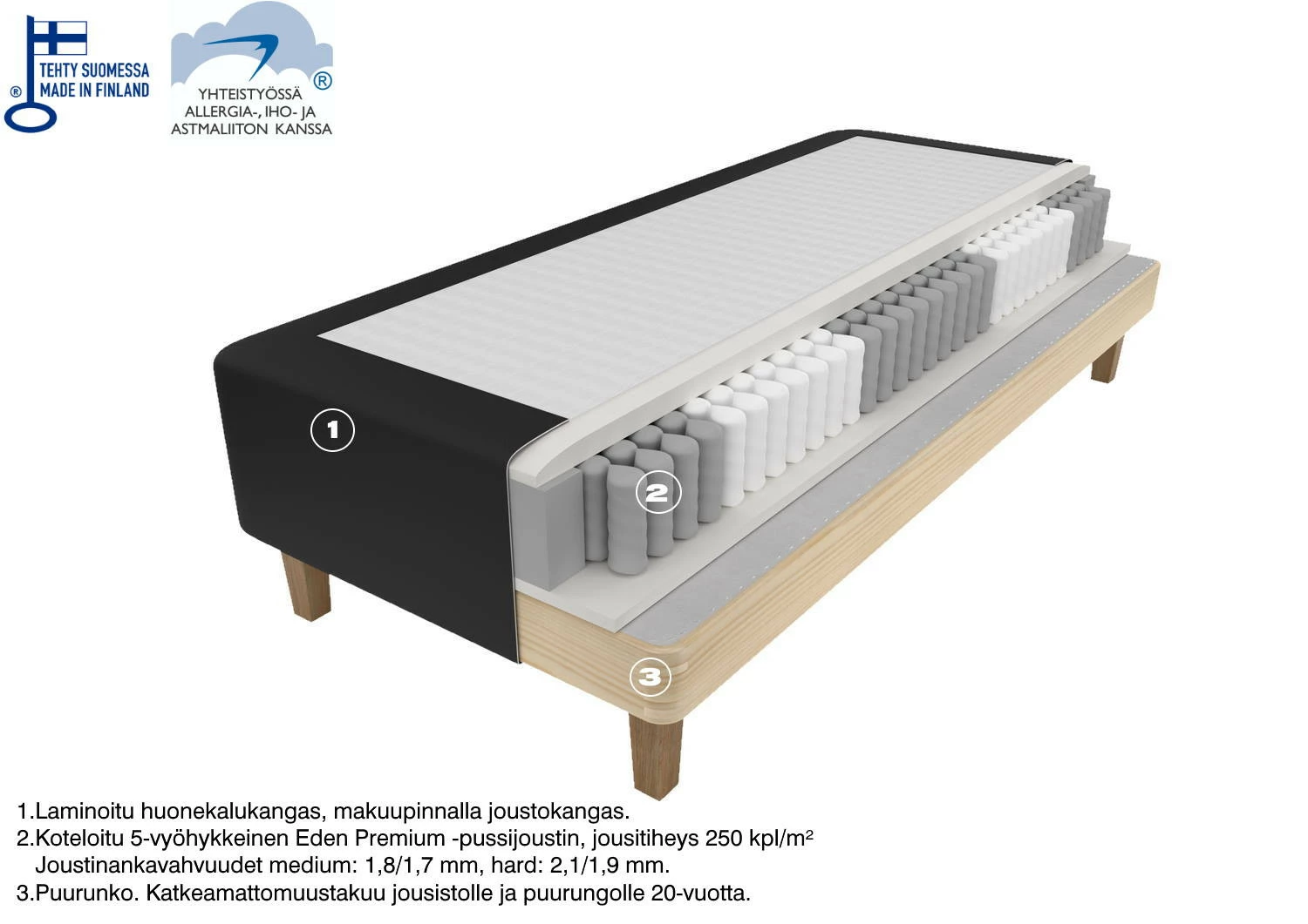 Eden-Premium 5-vyöhykkeinen pussijousitus. 250 jousta/m2.