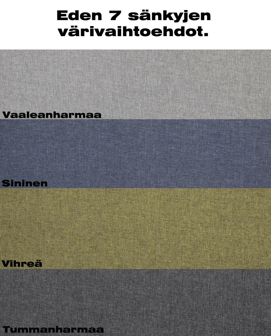 Voit valita sänkysi verhoiluvärin viidestä eri vaihtoehdosta: Vaaleanharmaa, tummanharmaa, sininen, beige tai vihreä. Myös jalkoihin on useampi erilainen vaihtoehto valittavissa.