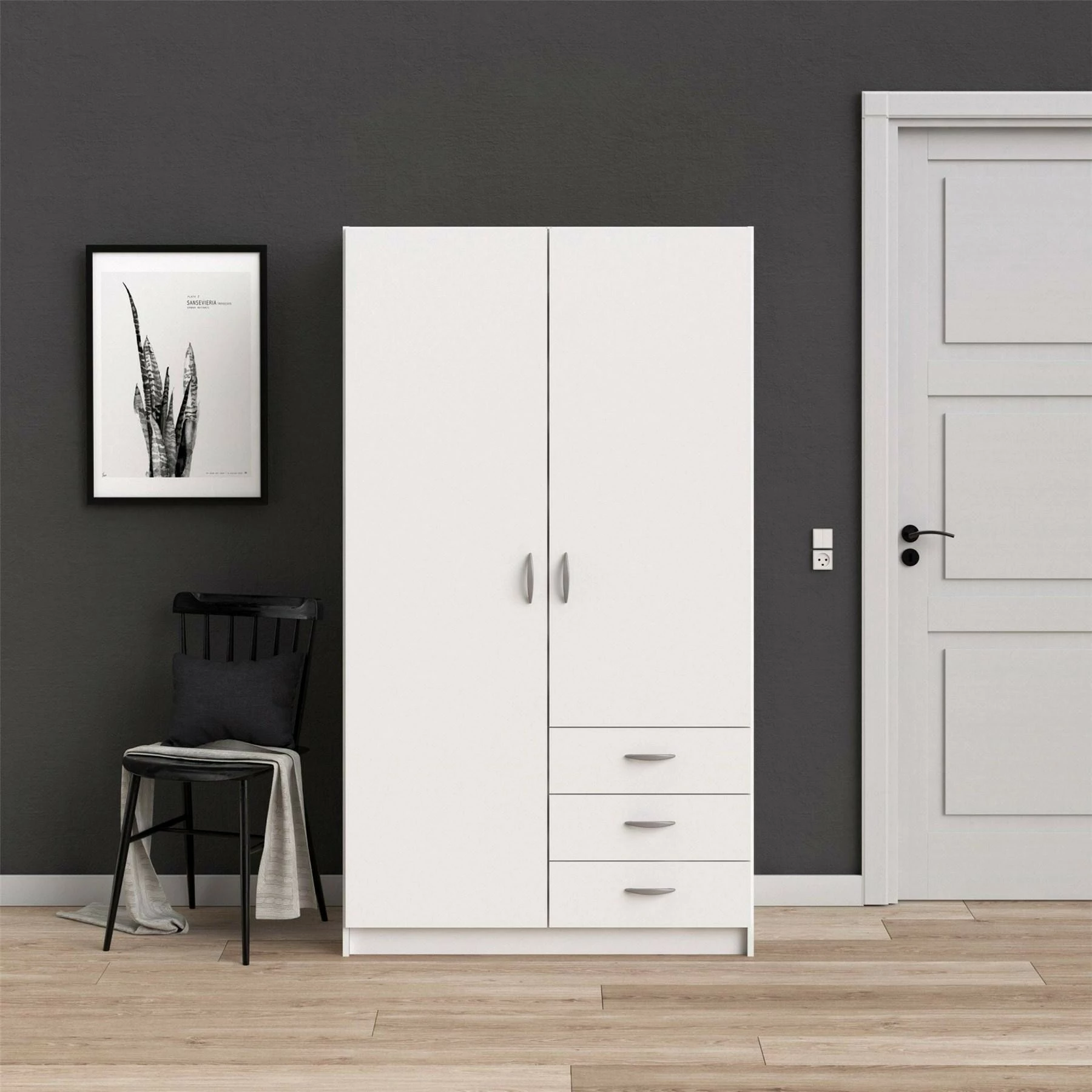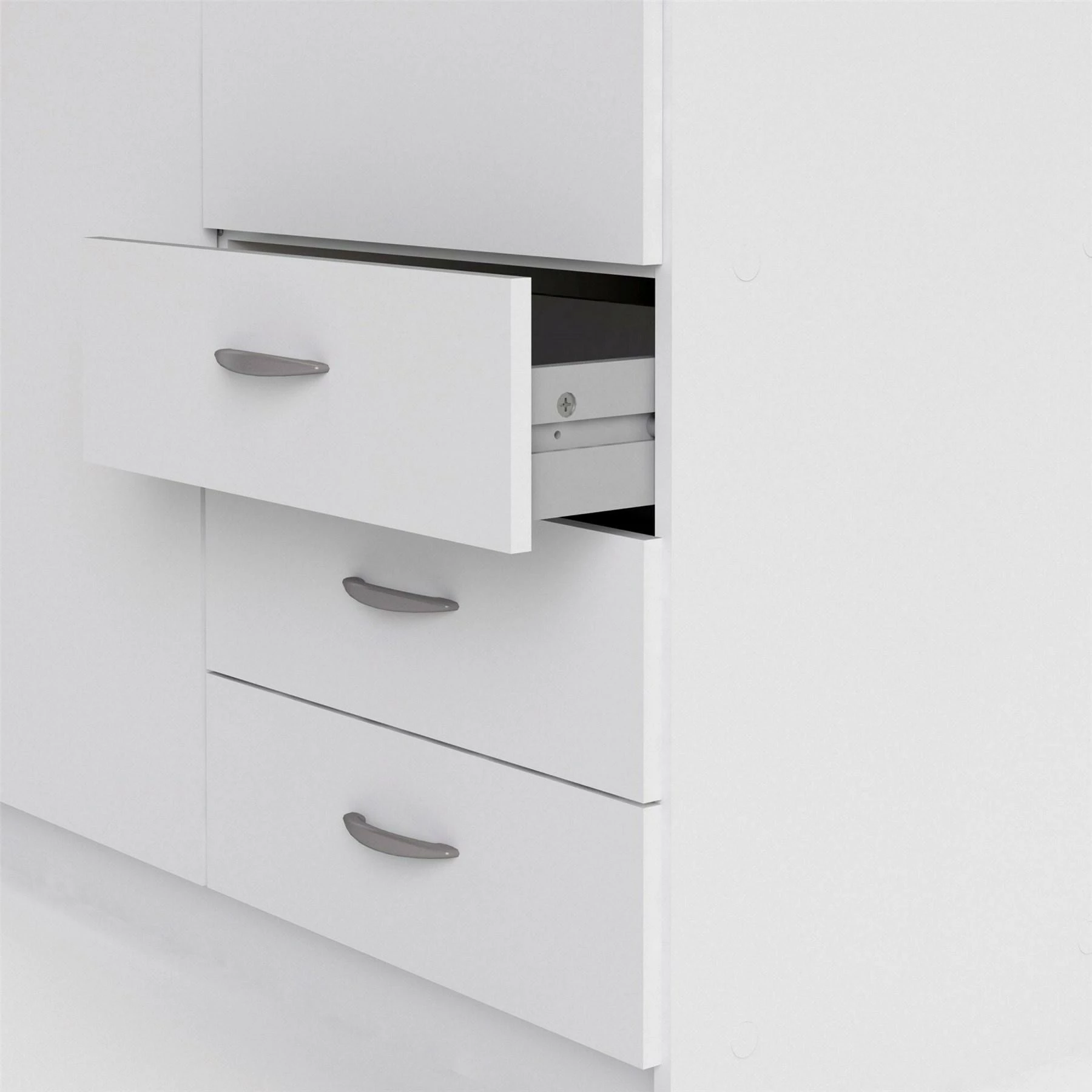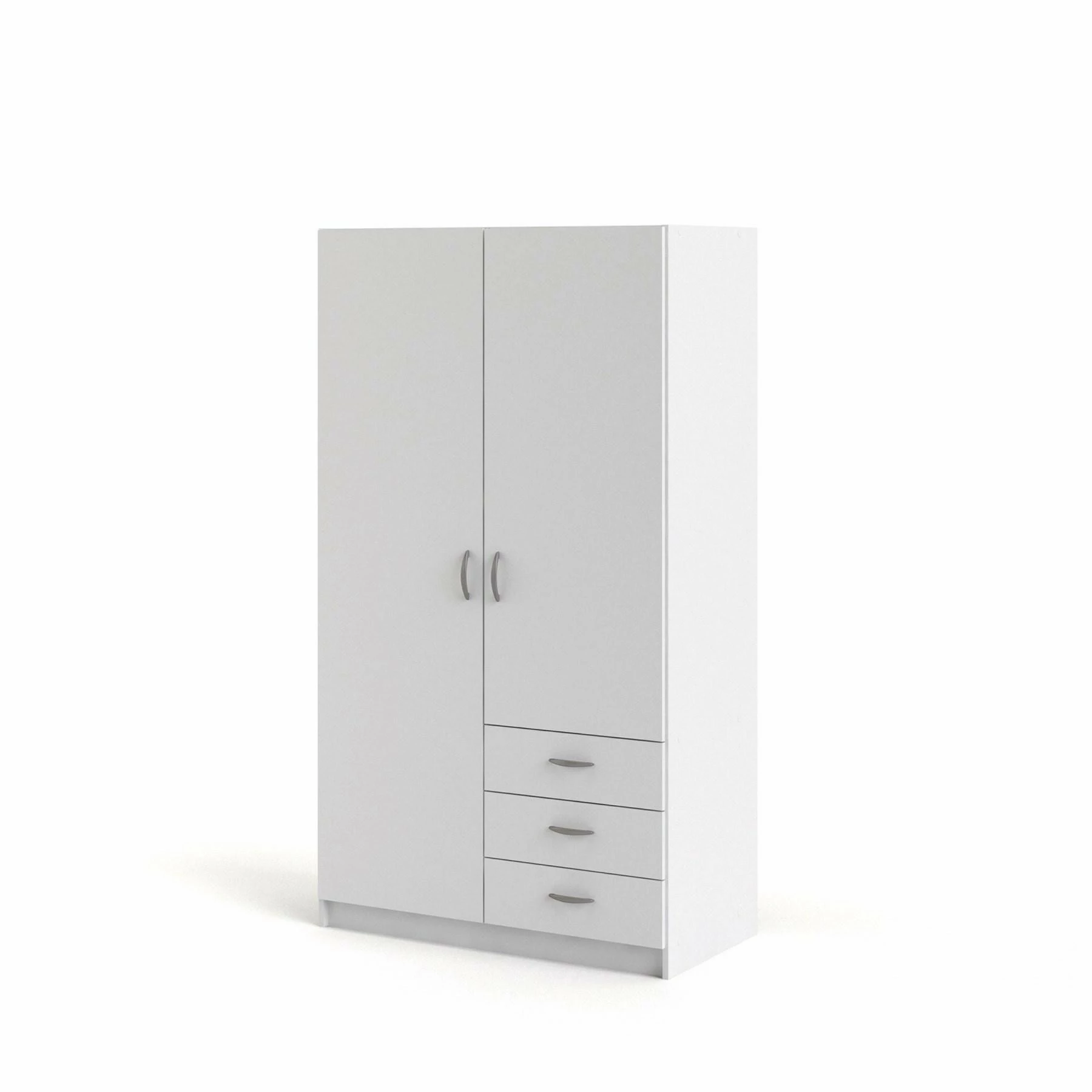 Focus vaatekomero on edullinen valkoinen kaappi laatikostosetillä. Komeron pidemmän oven takaa löytyy henkaritanko paidoille ja muille vaatteille, lyhyemmän oven takana oleva tila on jaettu irtohyllyillä.