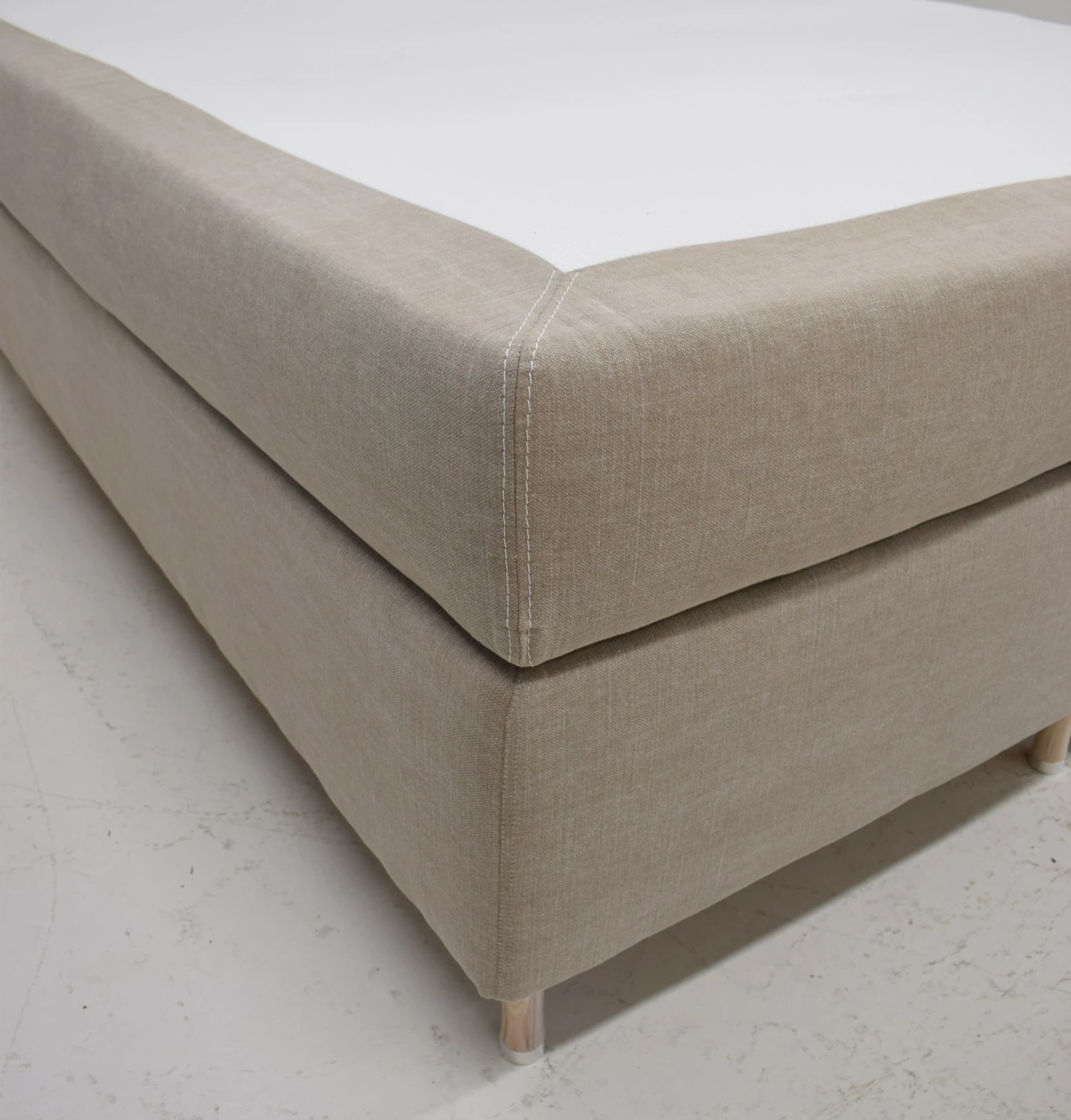 Uniikki Zone sänky on verhoiltu lämminsävyisellä beigellä verhoilukankaalla, patjojen pinnoissa valkoinen josutokangas ikkuna joka auttaa pitämään myös sijauspatjan paikoillaan. Zone jenkkisängyn ulkonäön viimeistelee valkolakatut saarnijalat.
