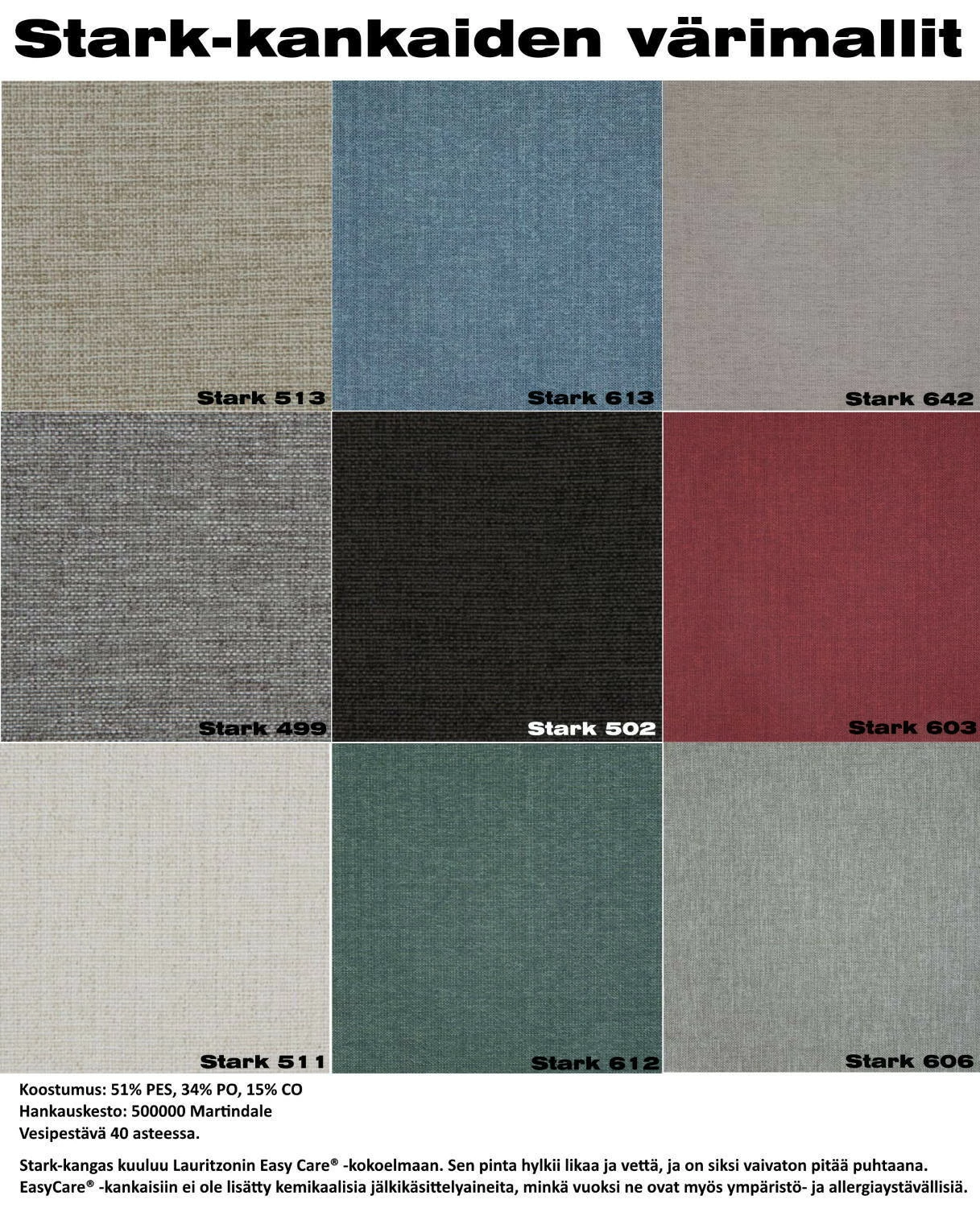 Linjakas Style-sohva on verhoiltu kestävällä Stark-kankaalla, josta löydät useita kauniita väri vaihtoehtoja ja kangas voidaan pestä 40 asteessa. Sohvan rennon mukavan istuttavuuden tarjoaa untuvahöyhen-täytteiset selkä- ja istuintyynyt, istuimissa pohjakerroksen on myös kimmoisa hr-vaahtomuovi jonka ansiosta tyynyt pitävät muotonsa ja sopivan kimmoisuuden pitkään. Sohvan siron ulkomuodon viimeistelee 18 cm. korkeat mustat metallijalat, joiden ansiosta sohvan alustan siivoaminen onnistuu myös helposti.