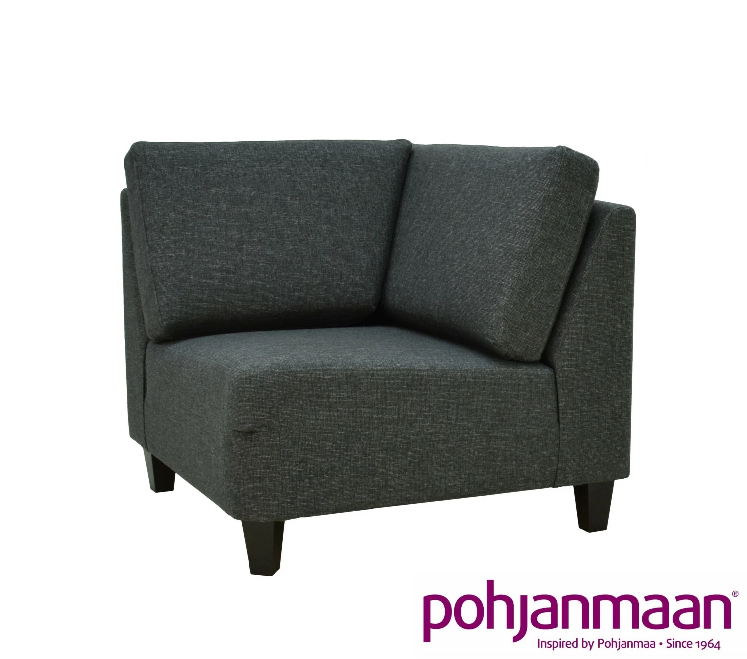 Jokainen sohvamoduli on omilla jaloilla ja sivuistakin alas asti verhoiltu, osat saa liitettyä toisiinsa helposti mukana toimitettavilla kiinnityskoukuilla.