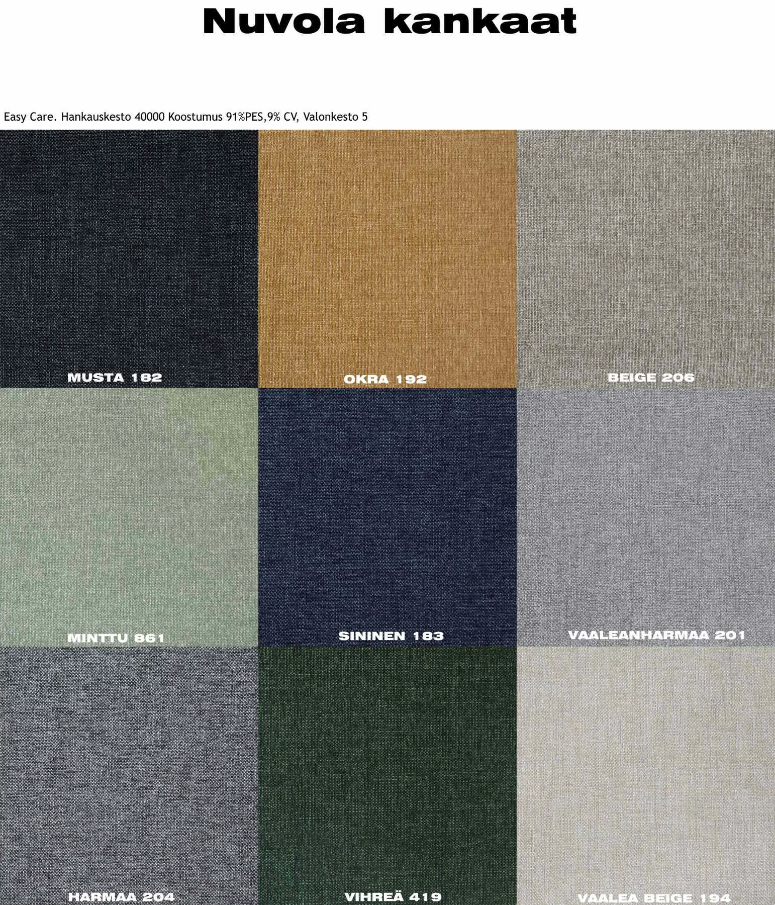 2-istuttava Dolphin on verhoiltu erittäin kestävällä, helppohoitoisella ja pehmeän tuntuisella Laurizonin Nuvola kankaalla. Kangas kuuluukin Laurizonin Easy Care mallistoon: Helppohoitoisuus on kankaiden rakenteen ansiota, sillä easycare-kankaat ovat valmistettu sileistä kuiduista, joten lika ei tartu kuituun, eikä kankaisiin ole tarvinnut lisätä jälkikäsittelykemikaaleja. Näin ollen easycare-kankaat ovat turvallisia sekä ihmisille että ympäristölle. Easycare-malliston kankaat ovat Öko-Tex®- ja REACH-sertifioituja.