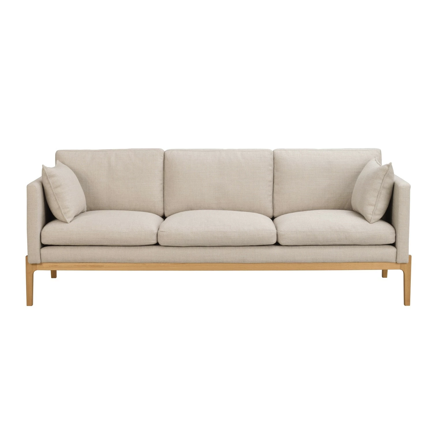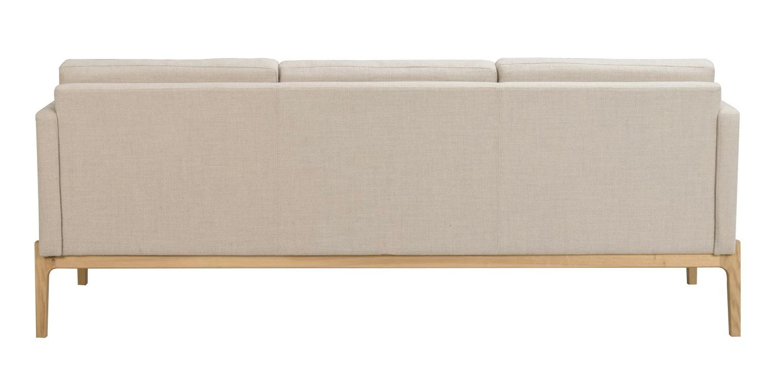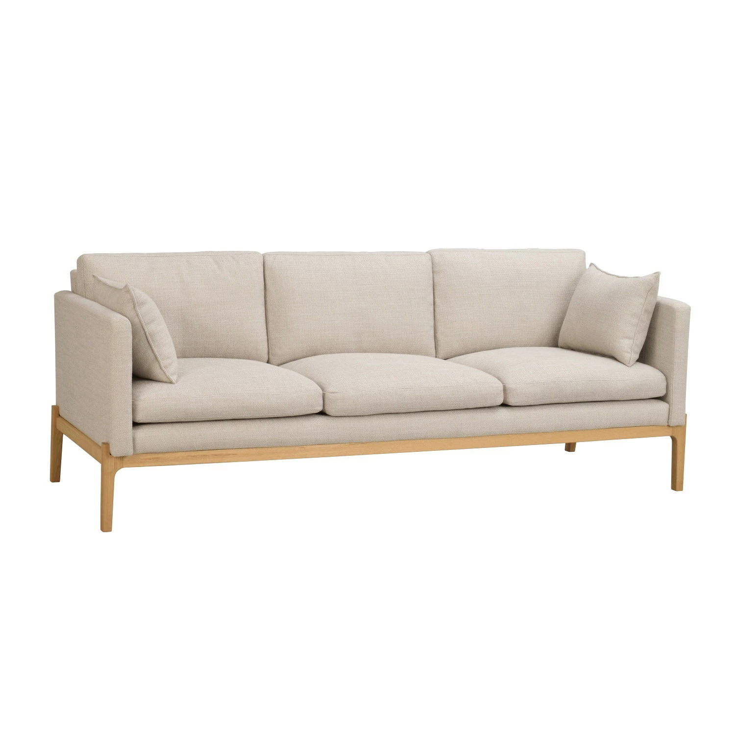 Kolmenistuttava sohva on verhoiltu kestävällä ja helppohoitoisella beigen sävyisellä kankaalla, istuin ja selkätyynyjen verhoilu on irroitettavissa.