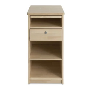 Seniori-yöpöydässä on lukollinen laatikko, vetotaso ja kolme avohyllyä.