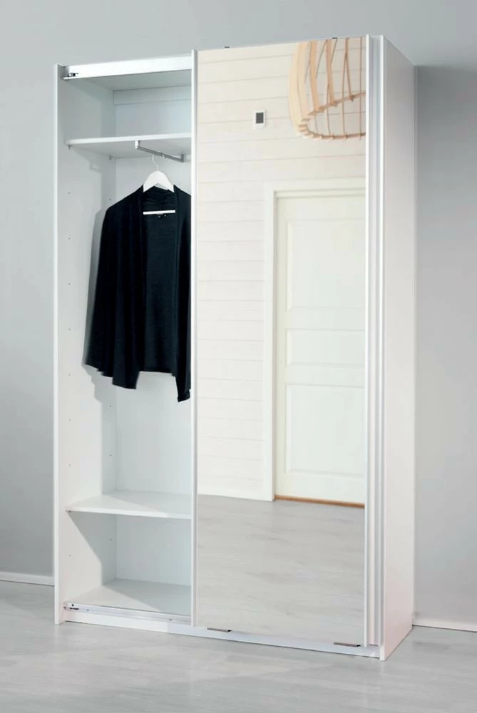 Stina komeron sisus on jaettu väliseinällä, mukana toimitetaan henkaritangot ja kaksi välihyllyä, voit halutessassi tilata lisävarusteena myös komeroon sopivan hyllysetin.